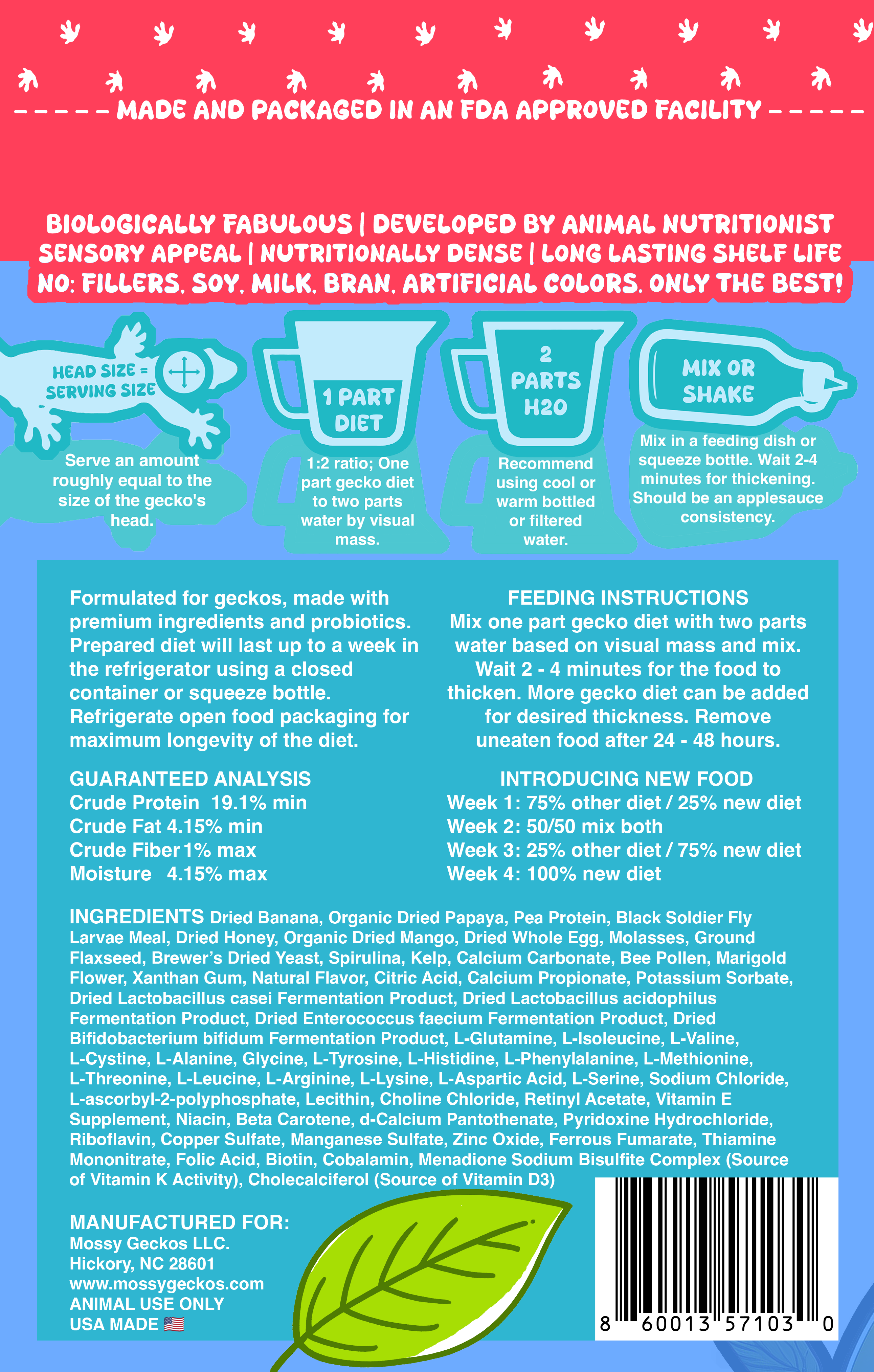 INGREDIENTS Dried Banana, Organic Dried Papaya, Pea Protein, Black Soldier Fly Larvae Meal, Dried Honey, Organic Dried Mango, Dried Whole Egg, Molasses, Ground Flaxseed, Brewer’s Dried Yeast, Spirulina, Kelp, Calcium Carbonate, Bee Pollen, Marigold Flower, Xanthan Gum, Natural Flavor, Citric Acid, Calcium Propionate, Potassium Sorbate, PROBIOTICS Dried Lactobacillus casei Fermentation Product, Dried Lactobacillus acidophilus Fermentation Product, Dried Enterococcus faecium Fermentation Product, Dried Bifidobacterium bifidum Fermentation Product, L-Glutamine, L-Isoleucine, L-Valine, L-Cystine, L-Alanine, Glycine, L-Tyrosine, L-Histidine, L-Phenylalanine, L-Methionine, L-Threonine, L-Leucine, L-Arginine, L-Lysine, L-Aspartic Acid, L-Serine, Sodium Chloride, L-ascorbyl-2-polyphosphate, Lecithin, Choline Chloride, Retinyl Acetate, Vitamin E Supplement, Niacin, Beta Carotene, d-Calcium Pantothenate, Pyridoxine Hydrochloride, Riboflavin, Copper Sulfate, Manganese Sulfate, Zinc Oxide, Ferrous Fumarate, Thiamine Mononitrate, Folic Acid, Biotin, Cobalamin, Menadione Sodium Bisulfite Complex (Source of Vitamin K Activity), Cholecalciferol (Source of Vitamin D3)